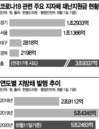 재난지원금 지급 등 비용이 크게 늘면서 지방채 발행도 급증 추세다. 올해 8월11일 기준 17개 지자체의 지방채 발행 총액은 5조2483억원으로 지난해 연간 발행액(5조4345억원)에 육박했다. 하반기에도 지자체들이 재난지원금을 지급하고 있어 올해 지방채 발행액은 6조원에 달할 전망이다. 지난해 지방채 발행액 역시 전년 대비 86.7%(2조9112억원) 증가했다. 지방채 발행은 2년 새 평균 80.3%나 증가했다.