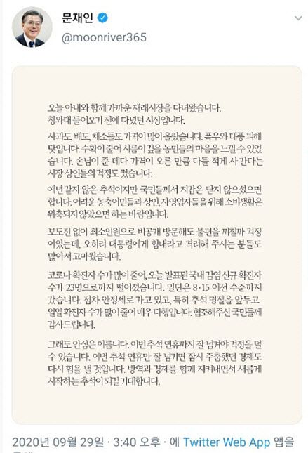 문 대통령은 “오늘 아내와 함께 가까운 재래시장을 다녀왔다. 청와대 들어오기 전에 다녔던 시장”이라면서 “사과도, 배도, 채소들도 가격이 많이 올랐다. 폭우와 태풍 피해 탓”이라고 말문을 열었다. “수확이 줄어 시름이 깊을 농민들의 마음을 느낄 수 있었다”며 “손님이 준 데다 가격이 오른 만큼 다들 적게 사 간다는 시장상인들의 걱정도 컸다”고도 말했다.