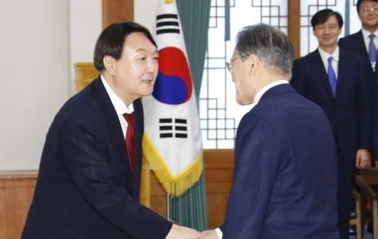 2019년 7월 청와대에서 문재인 대통령이 윤석열 검찰총장에게 임명장을 수여한 직후 악수하고 있다 [연합] |