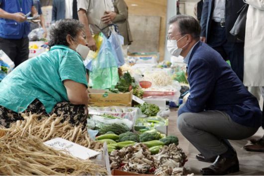 문재인 대통령과 김정숙 여사 내외는 29일 추석 연휴를 맞아 재래시장을 방문해 코로나19로 어려움을 겪는 상인들을 격려했다.