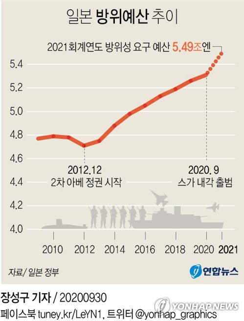 또 아베 내각 계승을 표방하는 스가 요시히데(菅義偉) 정부가 출범하고 처음 집행하는 방위 예산이 역대 최대 기록을 경신하게 된다.