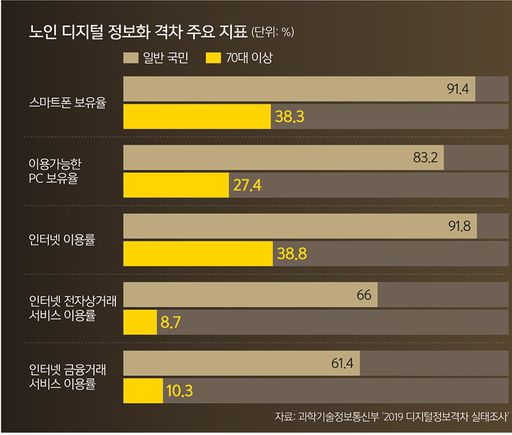 다른 연령대와 70세 이상 노인 세대 간의 정보화 격차는 통계에서도 드러난다. 과학기술정보통신부와 한국정보화진흥원이 진행한 ‘2019년 디지털정보격차 실태조사’에 따르면 스마트폰 보유율은 국민 평균이 91.4%에 달하지만 70대 이상 노년층에선 38.3%에 그쳤다. 개인용컴퓨터(PC) 보유율 역시 국민 평균이 83.2%인 데 반해 70대 이상은 27.4%에 불과했다. 정보기술(IT) 기기 보유율의 격차는 정보 이용률 격차로 이어졌다. 국민 평균 인터넷 이용률은 91.8%에 달하지만 70세 이상 세대에선 38.8%만이 인터넷을 이용한다고 답했다.
