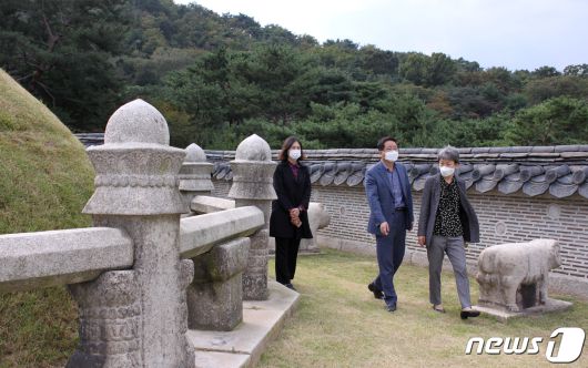 (서울=뉴스1) 구윤성 기자 = 추석 연휴인 30일 오후 정재숙 문화재청장(오른쪽)과 나명하 궁능유적본부장이 서울 성북구 의릉을 찾아 현장점검을 하고 있다. 유네스코 세계유산인 조선왕릉 의릉은 조선 제20대 임금 경종과 선의왕후의 능으로, 사적 제204호로 지정돼 있다. (문화재청 제공) 2020.10.1/뉴스1