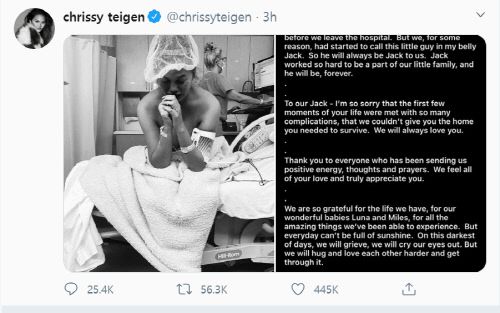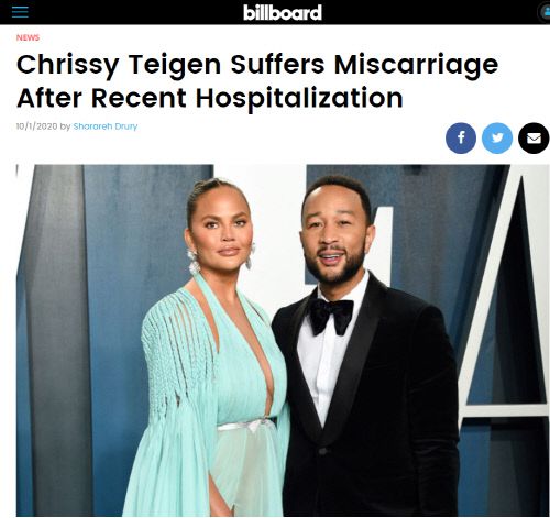 가수 존 레전드의 아내이자 미국의 모델 겸 배우인 크리시 티건은 지난 30일(현지시각) 자신의 SNS를 통해 유산 소식을 알렸다. 티건은 병원 침대에서 울고있는 자신의 흑백 사진과 함께 “우리는 그 소식을 듣고 매우 깊은 실의에 빠졌다. 전에 느껴본 적 없던 고통이었다. 하혈을 멈출 수 없었고 수많은 수혈과 수액도 충분하지 않았다”고 전했다.
