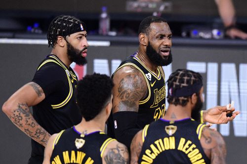 LA 레이커스 앤서니 데이비스와 르브론 제임스는 3일(한국 시간) NBA 결승 2차전에서 합작 65점을 작성하며 마이애미 히트를 124-114로 누르고 선제 2승을 거뒀다. 전반전에 제임스가 심판 판정에 항의하는 모습. |