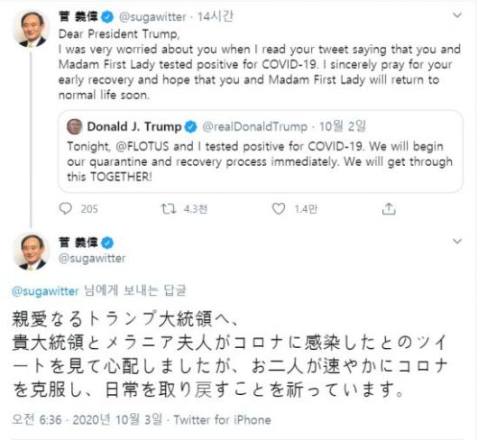 3일 스가 총리는 본인의 트위터를 통해 "(트럼프 대통령 부부가) 코로나19에 감염됐다는 트윗을 보고 걱정했다"며 "두 분이 어서 코로나19를 극복하고 일상의 삶을 되찾기를 기원한다"고 밝혔다. 스가 총리는 같은 내용의 글을 영어와 일본어로 함께 올렸다.
