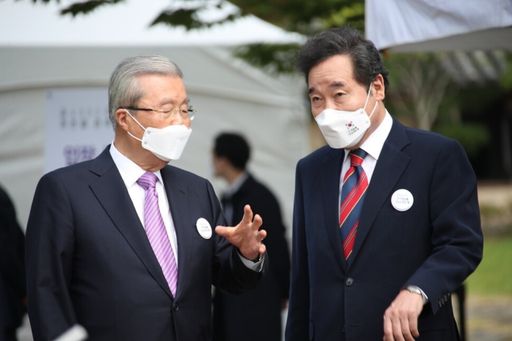 더불어민주당 이낙연 대표(오른쪽)와 국민의힘 김종인 비상대책위원장이 3일 오전 서울 경복궁 내 국립민속박물관 앞 광장에서 열린 제4352주년 개천절 경축식을 마친 뒤 대화하며 이동하고 있다. 연합뉴스 |