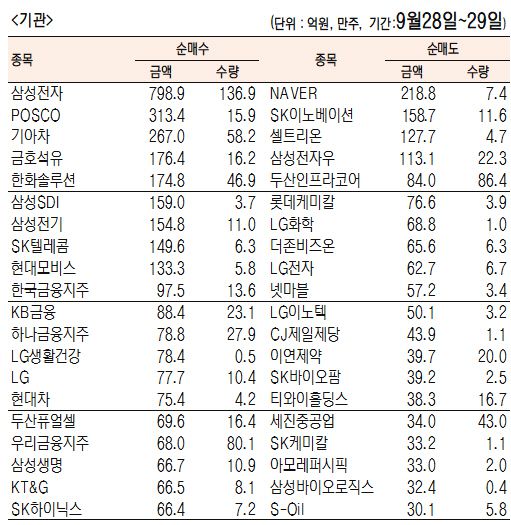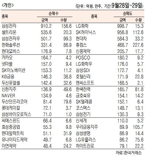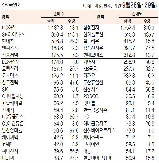 [표]주간 유가증권 기관·외국인·개인 순매수·도 상위종목(9월 28일~29일)