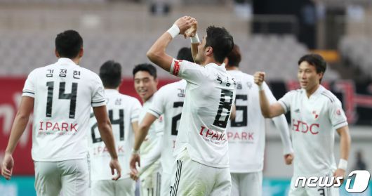 (서울=뉴스1) 박지혜 기자 = 4일 오후 서울 마포구 상암동 서울월드컵경기장에서 열린 프로축구 '하나원큐 K리그 2020' FC서울과 부산 아이파크의 경기에서 부산 박종우가 프리킥으로 득점에 성공한 뒤 세리머니를 하고 있다. 2020.10.4/뉴스1pjh2580@news1.kr[© 뉴스1코리아(news1.kr), 무단 전재 및 재배포 금지]