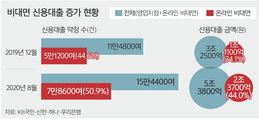 개별 은행에 따라서는 최근 비대면 신용대출 비중이 60∼70%대에 이른 경우도 많았다. 한 시중은행은 8월 신규 신용대출 3만9551건 중 71.8%(2만8394건)가 비대면으로 이뤄졌다. 금액으로는 1조3450억원 중 58.9%(7925억원)가 비대면 신용대출이었다.