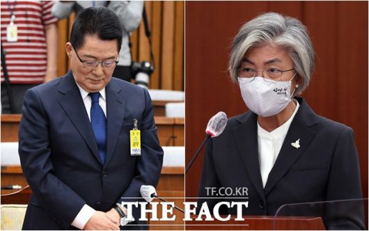 박지원 국가정보원장(왼쪽)과 강경화 외교부 장관이 가족 문제와 관련해 엇갈린 평가가 나온다. 박 원장은 미국에서 큰형의 장례식에 불참을 선택했지만, 강 장관의 남편 이일병 연세대 명예교수는 개인 사유를 들어 미국으로 출국했기 때문이다. /남윤호·이새롬 기자 |
