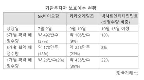 SK바이오팜의 주가가 오버행 이슈로 직격탄을 맞자 후발 주자인 카카오게임즈, 빅히트엔터테인먼트의 보호예수 만기 일정에 대해서도 관심이 쏠린다.