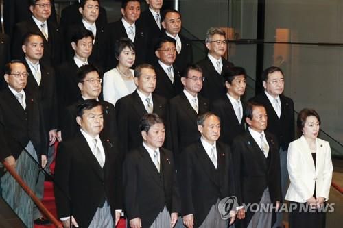 스가 요시히데 일본 총리(앞쪽 가운데)가 지난달 16일 관저에서 다른 각료들과 함께 기념사진을 찍고 있다. [EPA=연합뉴스 자료사진] |