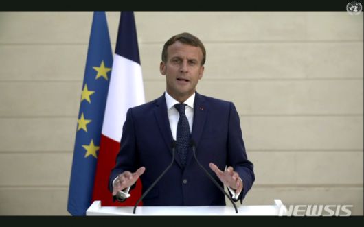 [AP/뉴시스] 에마뉘엘 마크롱 프랑스 대통령이 22일(현지시간) 화상으로 진행된 제75차 유엔총회에서 연설을 하고 있다. 마크롱 대통령은 이날 북한을 향해 완전하고 검증가능하며 불가역적인 비핵화(CVID)를 촉구하고, 이는 한반도의 항구적인 평화와 정치적 해답을 얻기 위한 유일한 방법이라고 강조했다. 2020.9.23. |