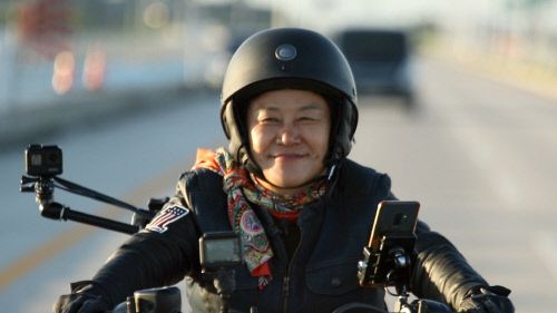 할부로 산 할리 데이비슨을 타고 신나게 달리는 신계숙 교수. 제공|EBS |