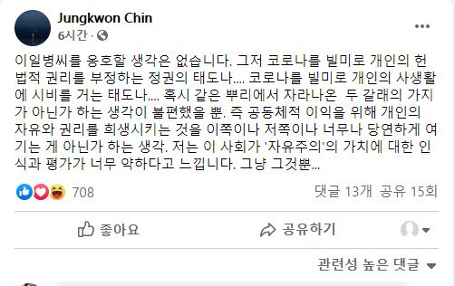 진 전 교수는 이날 자신의 페이스북에 글을 올려 “이일병씨를 옹호할 생각은 없다”면서도 “그저 코로나를 빌미로 개인의 헌법적 권리를 부정하는 정권의 태도나 코로나를 빌미로 개인의 사생활에 시비거는 태도가 같은 뿌리에서 자라나온 두 갈래의 가지가 아닌가 하는 생각이 불편했을 뿐“이라고 밝혔다.