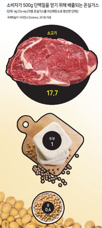이는 소가 먹을 사료의 생산과 소가 먹고 배설하는 과정, 그리고 가공·유통시 발생하는 온실가스를 합한 수치다. 반면 동일한 양의 두부는 1㎏ CO₂-eq, 콩은 0.4㎏ CO₂-eq에 그친다.