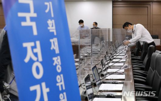 [세종=뉴시스강종민 기자 = 2020년 국정감사를 하루 앞둔 6일 오전 정부세종청사 기획재정부 회의실에서 직원들이 국정감사장 설치를 하느라 분주하게 움직이고 있다. 2020.10.06. ppkjm@newsis.com |