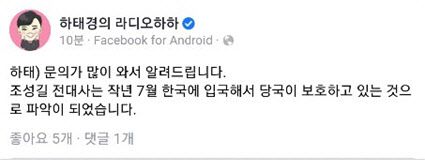 하태경 국민의힘 의원은 6일 저녁 사회관계망서비스(SNS)를 통해 “조 전 대사는 지난해 7월 한국에 입국해 당국이 보호하고 있는 것으로 파악됐다”고 밝혔다.