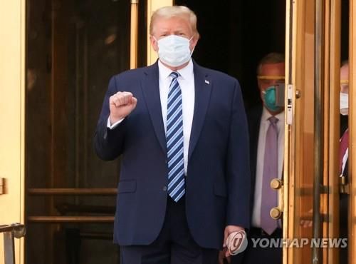(베데스다 로이터=연합뉴스) 신종 코로나바이러스 감염증(코로나19)에 걸린 도널드 트럼프 미국 대통령이 지난 5일(현지시간) 입원해 있던 메릴랜드주 베데스다의 월터 리드 군 병원 현관문을 나서며 주먹을 불끈 쥐고 있다. 트럼프 대통령은 입원 사흘 만인 이날 오후 병원에서 퇴원해 백악관으로 복귀했다. |
