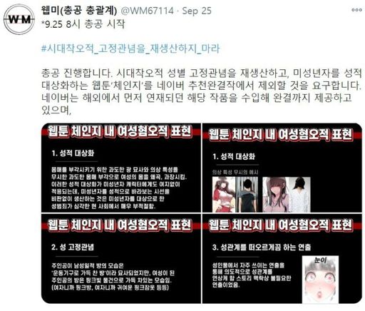 앞서 웹툰의 여성혐오를 제보 받는 트위터 계정 ‘웹미’는 지난달 25일 ““시대착오적인 성별 고정관념을 재생산하고 미성년자를 성적 대상화하는 웹툰 ‘체인지’를 네이버 추천완결작에서 제외할 것을 요구한다”는 글을 올렸다.
