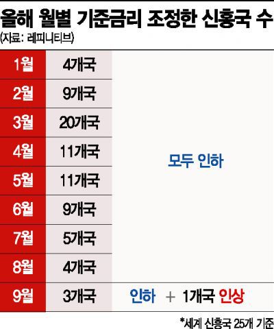 6일(현지시간) 주요 외신이 금융정보업체 레피니티브를 인용해 한 보도에 따르면 지난달 25개 신흥국 가운데 금리를 인하한 국가는 멕시코, 이집트, 나이지리아 등 3곳으로, 지난해 4월 이후 가장 적은 것으로 나타났다. 신흥국 중앙은행들은 올 초 코로나19 확산 직후 유동성을 공급하기 위해 곧바로 금리를 낮췄다. 지난 3월 신흥국 25개 중 80%에 해당하는 20개의 중앙은행은 금리를 낮췄다. 4~5월에도 각각 11개국이 기준금리를 하향 조정했지만 이후 서서히 금리를 내리는 신흥국은 줄었다.