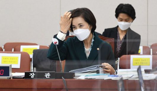 2020 국정감사 첫날인 7일 국회에서 열린 교육위원회의 교육부·국사편찬위원회 등에 대한 국정감사에서 유은혜 사회부총리 겸 교육부 장관이 감사 시작을 기다리고 있다. 연합뉴스 |