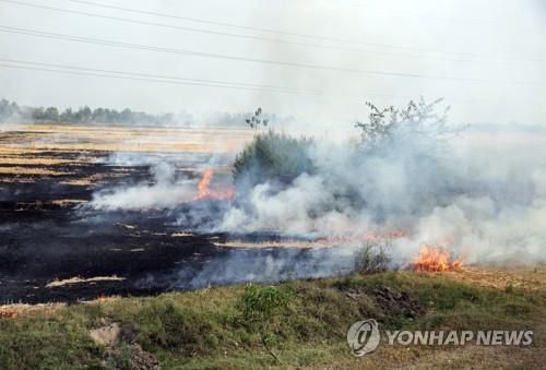 인도 북부 암리차르 인근에서 추수 잔여물이 불타는 모습. [EPA=연합뉴스] |