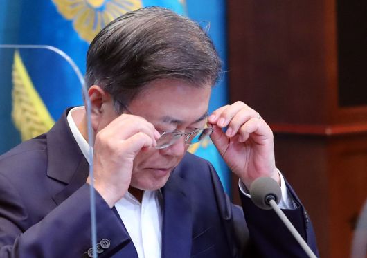 문재인 대통령이 5일 오후 청와대 여민관에서 열린 수석·보좌관 회의에서 안경을 고쳐쓰고 있다. /뉴시스 |