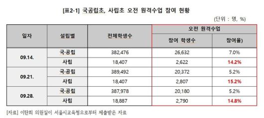 3분의 1 밀집도 지침이 시행된 뒤로도, 일부 사립초에선 ‘긴급돌봄’ 형태로 나머지 3분의 2 학생을 전원 등교시키는 꼼수를 썼다. 9월14일, 21일, 28일 서울시내 초등학교에서 피치 못할 사정에 있는 학생들이 ‘돌봄’ 성격으로 학교에 나와 수업을 받은 ‘오전 원격수업’ 현황을 보면, 사립초는 전체 학생 가운데 14~15%가 여기에 참여했다. 반면 국공립초의 ‘오전 원격수업’ 참여율은 5~7%에 그쳤다.