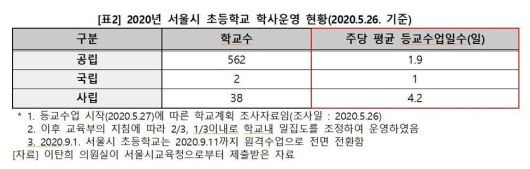 7일 이탄희 더불어민주당 의원이 지난 5월27일 1단계 등교수업이 이뤄질 당시 서울시내 초등학교들의 학사운영 계획을 확인해보니, 사립초등학교 38곳의 주당 평균 수업일수는 4.2일로 공립초등학교 562곳의 평균인 1.9일보다 2배 이상 많은 것으로 나타났다. 등교수업 없이 원격수업만 진행할 경우 학습 격차가 심화될 가능성이 크다는 점을 감안하면, 코로나19 상황에서 학비가 비싼 사립초와 그렇지 않은 공립초의 격차가 드러나는 대목이다.