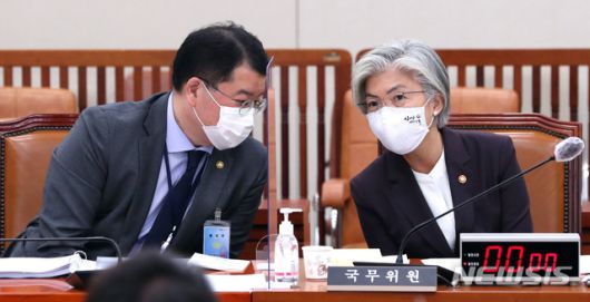 [서울=뉴시스] 김선웅 기자 = 강경화(오른쪽) 외교부 장관이 7일 오전 서울 여의도 국회에서 열린 외교통일위원회의 외교부에 대한 국정감사에서 최종건 1차관과 이야기를 하고 있다. (공동취재사진) 2020.10.07. photo@newsis.com |