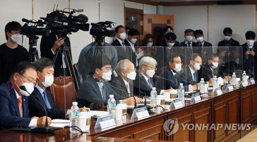 손경식 경총회장과 경영자들이 지난 6일 오전 서울 마포구 백범로 한국경영자총협회에서 열린 더불어민주당 이낙연 대표와 경총 간담회에서 이낙연 대표의 인사말을 듣고 있다. [연합뉴스 자료사진] |