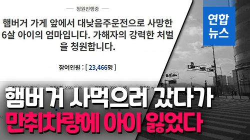 (서울=연합뉴스) 지난 6일 청와대 국민청원 게시판에 '햄버거 가게 앞에서 대낮 음주운전으로 사망한 6살 아이의 엄마입니다. 가해자의 강력한 처벌을 청원합니다'라는 제목의 글이 게시됐습니다.