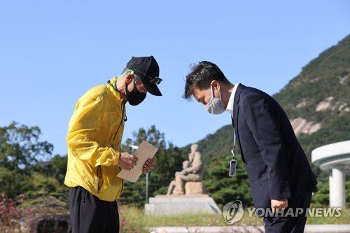 (서울=연합뉴스) 정성조 기자 = 서해 소연평도 북측 해역에서 북한군에 사살된 해양수산부 공무원 A씨의 형 이래진(55)씨가 A씨의 아들이 쓴 편지를 8일 청와대에 전달했다.