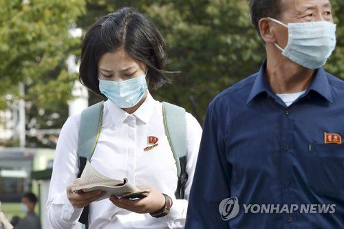마스크를 쓴 채 걸어가는 평양시민들 |