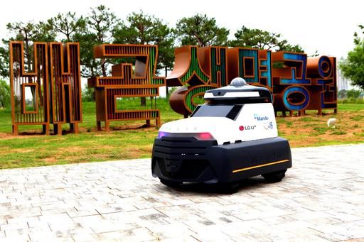 만도의 실외 자율주행 로봇 ‘골리’가 경기 시흥의 배곧생명공원을 순찰하고 있다. LG유플러스는 8일 만도와 ‘5G 실외 자율주행 로봇사업’을 위해 협력하기로 했다고 밝혔다. LG유플러스 제공 ⓒ 세상을 보는 눈, 세계일보