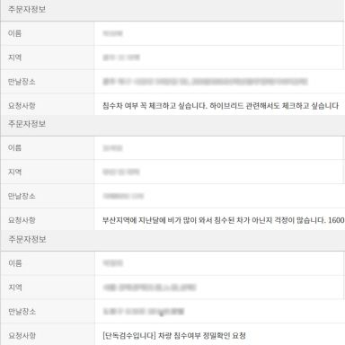 8일 관련 업계에 따르면 침수차 여부를 스스로 판단하기 어려운 소비자들을 중심으로 중고차 점검 동행 서비스에 대한 관심이 높아지고 있다. C 자동차 정비 동행 서비스 업체는 올해 7~8월 들어 차량 검수 서비스 고객이 전년 대비 약 150%가량 증가했다고 밝혔다. C업체의 한 관계자는 “최근 문의를 하는 고객 가운데 30~40% 정도가 침수 여부를 확인하기 위해 검수 서비스를 이용하는 것으로 분석하고 있다”고 밝혔다. 서울 마포구에서 동행 서비스를 병행하는 정비사 권모(45)씨는 “8월 중순까지만 해도 거의 침수차 관련 문의는 없었는데 9월 중순부터 관련 문의가 점점 늘더니 이번주에만 3~4명의 손님과 상담을 했다”고 설명했다.