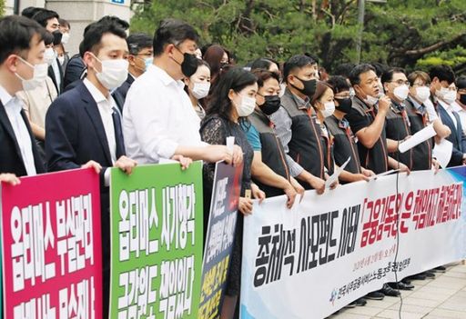 지난 6월 29일 오전 서울 여의도 금융감독원 앞에서 전국사무금융서비스노조 관계자들이 “금융감독원이 옵티머스 사모펀드 상환 불능 사태에 대해 책임지라”고 촉구하고 있다. 연합뉴스 |