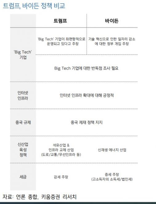 먼저 중국 규제에 대해서는 궤를 같이 한다고 봤다. 트럼프 행정부 하의 중국 수입 관세 강화, 화웨이나 틱톡과 같은 중국 기업들에 대한 제재강화 등 중국에 대한 견제 정책들이 지속되고 있는데, 바이든의 정책 고문들 역시 트럼프 행정부의 중국 견제 정책들에 대해 지지한다고 밝힌 바 있다고 언급했다.