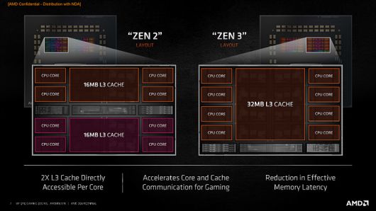 16코어, 32스레드, 72MB 캐시의 AMD 라이젠 5950X를 필두로 한 라이젠 5000 시리즈는 신형 젠 3 아키텍처를 적용했다. 기존의 젠 2 아키텍처가 1개의 CCX가 4코어와 16MB L3 캐시로 구성되어 있어, 1개의 CCD에 총 2개의 CCX가 탑재된 구조였다. 하지만 젠 3 아키텍처에서는 1개의 CCX만 적용되어 8코어가 32MB 공유 캐시를 갖게 된다.