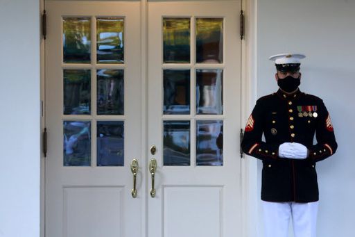 미국 해병대 병사가 8일(현지시간) 도널드 트럼프 대통령이 집무하고 있을 것으로 추정되는 백악관 웨스트윙 오벌 오피스 문을 지키고 서 있다. 코로나19로 입원 치료를 받고 지난 5일 퇴원한 트럼프 대통령은 가급적 언론 앞에 나서지 않고 있다. 워싱턴 로이터 연합뉴스 |
