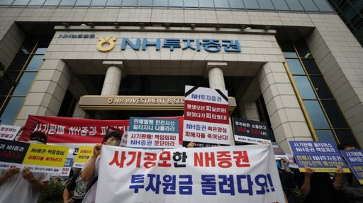 지난 7월 여의도 NH투자증권 앞에 모인 옵티머스 펀드 피해자 모임 구성원들이 사기 판매 규탄 집회를 벌였다. 연합뉴스 |