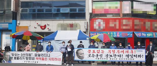 (보은=연합뉴스) 심규석 기자 = 더불어민주당 충북 보은군 정치발전위원회와 이 지역 민주당 당원들이 11일 보은읍 중앙사거리에서 무소속 박덕흠(충북 보은·옥천·영동·괴산) 의원 사퇴를 촉구하는 집회를 열었다.