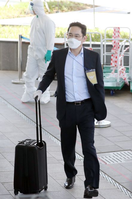 중국 시안 반도체 공장 방문을 마치고 김포공항을 통해 귀국한 이재용 삼성전자 부회장이 19일 오후 신종 코로나바이러스 감염증(코로나19) 검사를 받기 위해 공항 인근 대기 장소에 도착하고 있다. (사진=연합뉴스) |