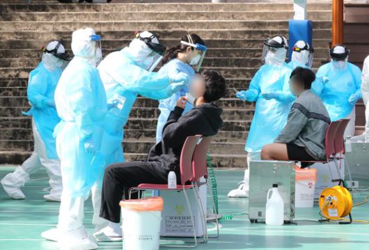 한 고등학교 선별진료소에서 학생들이 신종 코로나바이러스 감염증(코로나19) 검사를 받고 있다. 뉴스1 ▶ 중앙일보 '홈페이지' / '페이스북' 친구추가▶ 이슈를 쉽게 정리해주는 '썰리' ⓒ중앙일보(https://joongang.co.kr), 무단 전재 및 재배포 금지
