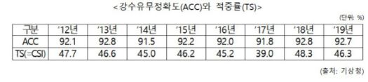 이같은 지적은 기상청이 그간 기상 예보의 정확도를 평가하는 기준인 강수유무정확도(ACC)로 92.7%의 예보 정확도를 가지고 있다고 밝혀왔지만, 강수유무적중률(TS) 기준으로는 46%에 그쳤기 때문에 나왔다. 이는 지난 2017년 감사원에서도 지적한 사항으로 기상청은 TS 기준 정확도도 발표하겠다고 했지만 2년 째 발표를 미루고 있다.