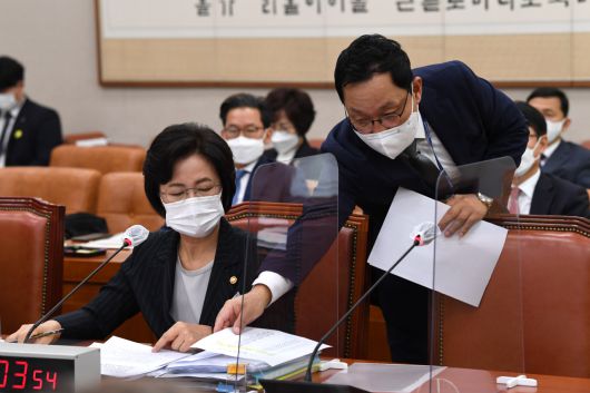 추미애 법무부 장관이 12일 서울 여의도 국회에서 열린 법제사법위원회의 법무부 등에 대한 국정감사에서 자료를 전달받고 있다. [연합] |