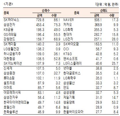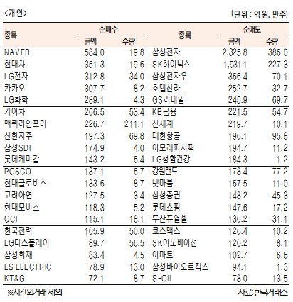 [표]유가증권 기관·외국인·개인 순매수·도 상위종목(10월 12일)