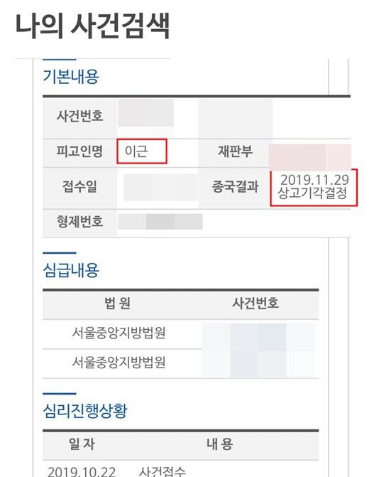 이어 "지금부터 하나씩 증거를 공개하겠다"며 피고인명 이근이 명시된 법원 사건 검색 기록 사진을 공개했다. 사진 속에는 지난해 10월 서울중앙지방법원에 접수된 성폭력범죄의처벌등에관한특례법 위반' 혐의 소송에 대한 기록이 담겨 있으며, 해당 사건은 지난해 11월 상고기각결정으로 마무리됐다.
